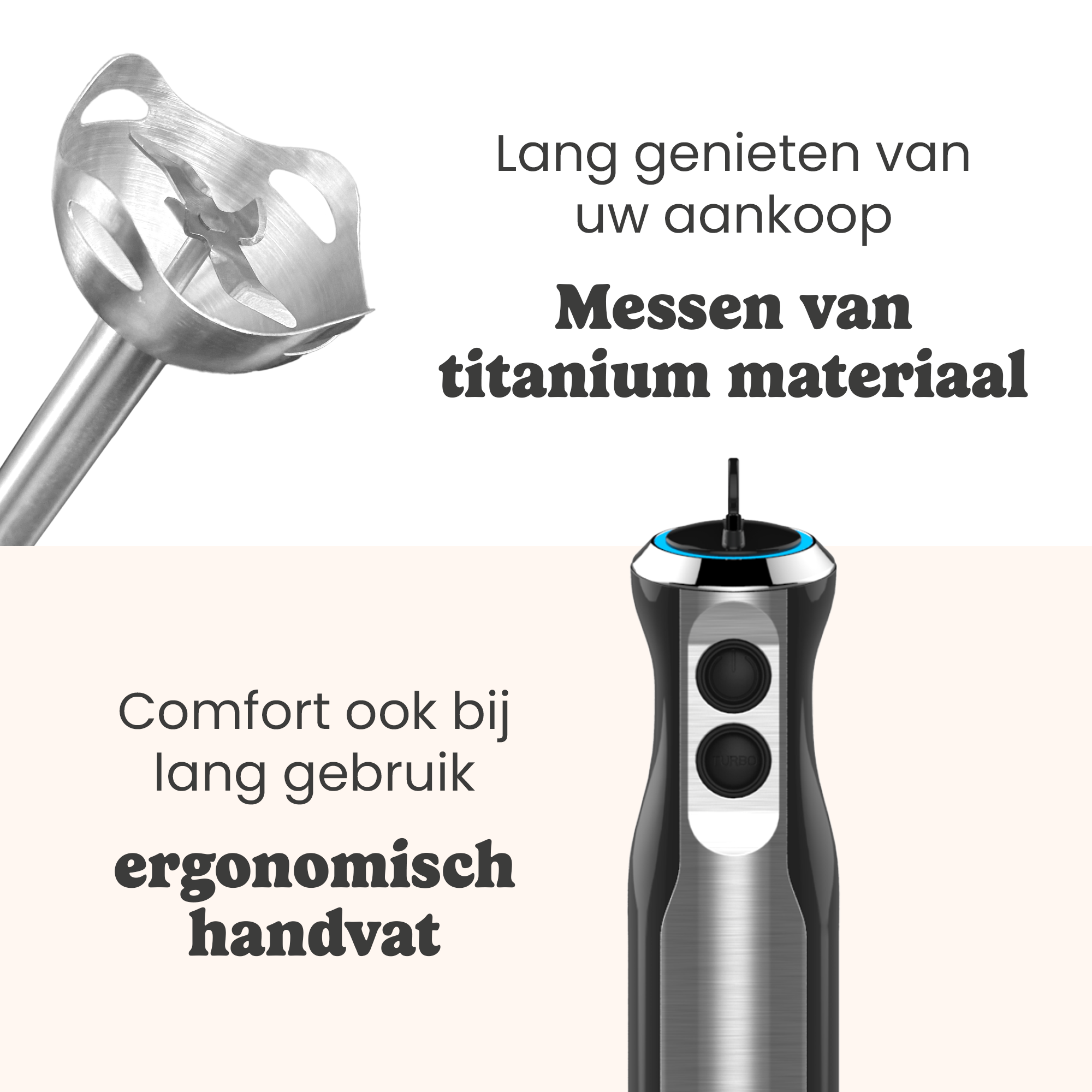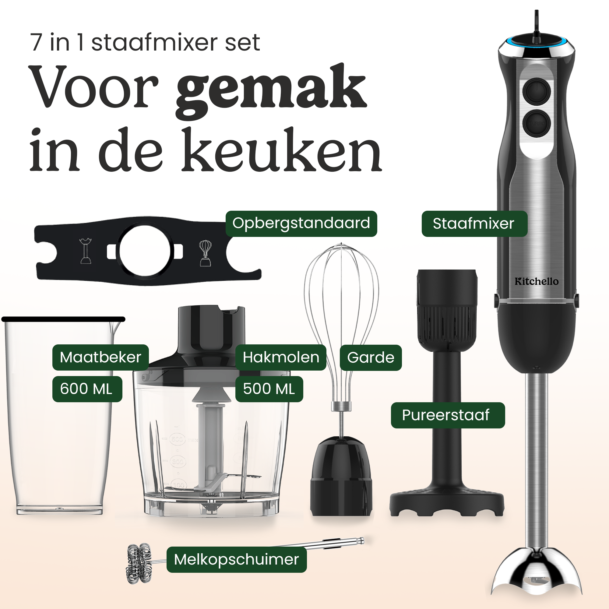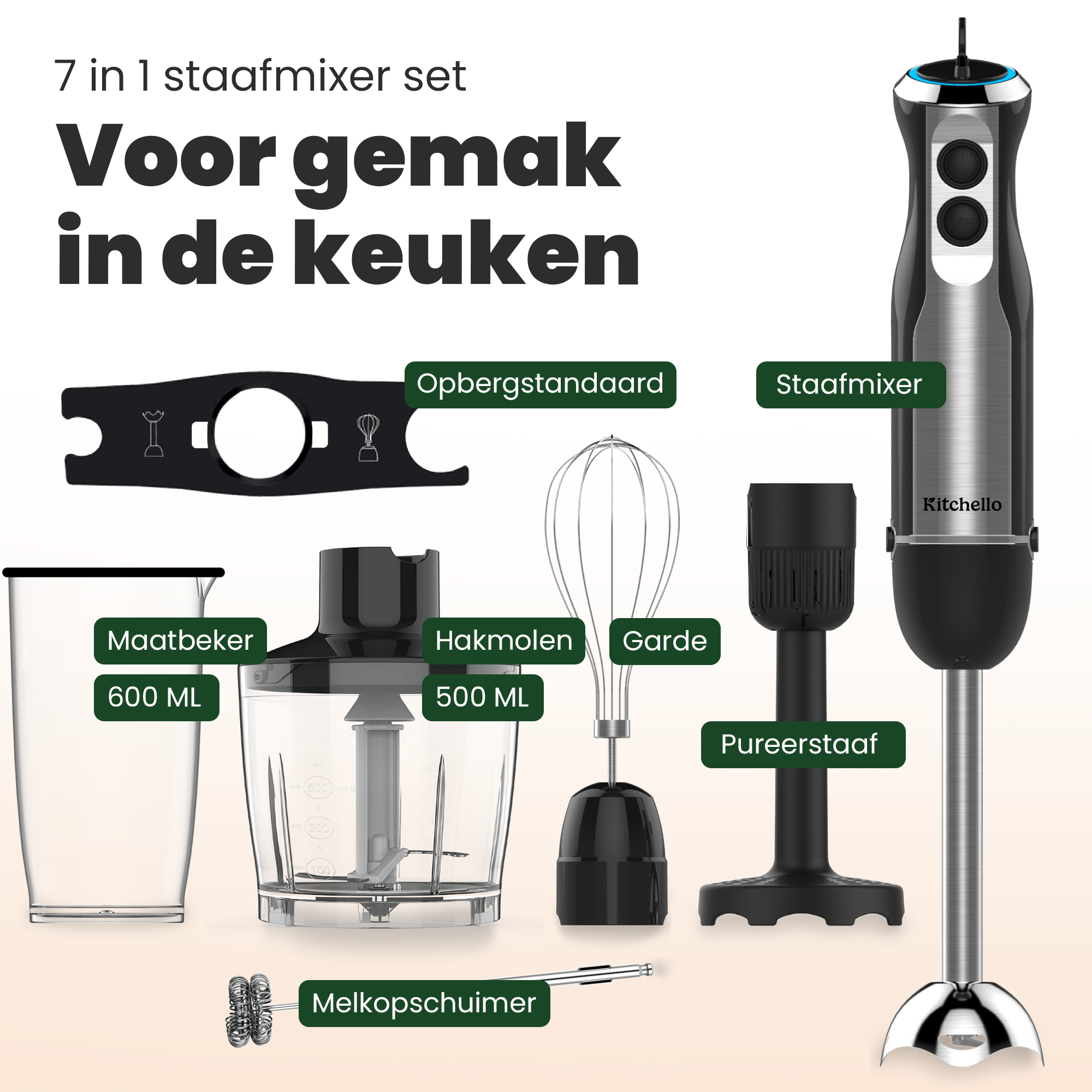 • 7 in 1 staafmixer set – Staafmixer, Hakmolen, Garde, melkopschuimer, maatbeker, Opbergstandaard, Pureerstaaf