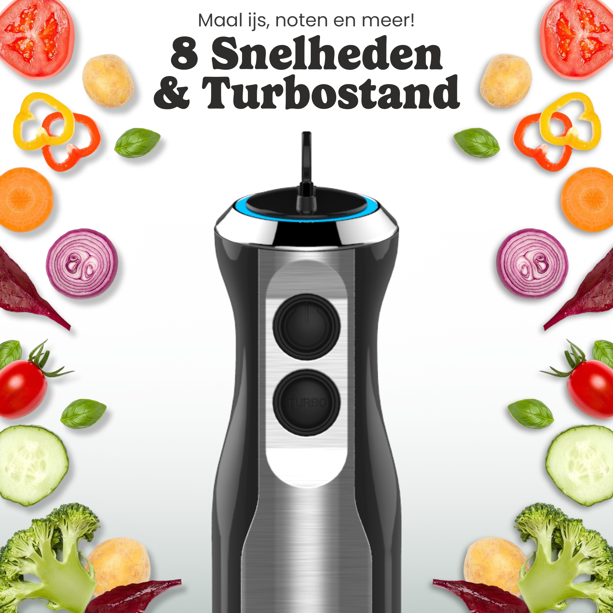 Of je nu een heerlijke smoothie maakt met bevroren fruit of een luchtige taart maakt met deze staafmixer kun je beide! Door de krachtige motor met 8 snelheden kun jij bepalen hoe snel je iets geklopt of geblend wilt hebben, zo slaagd ieder recept!